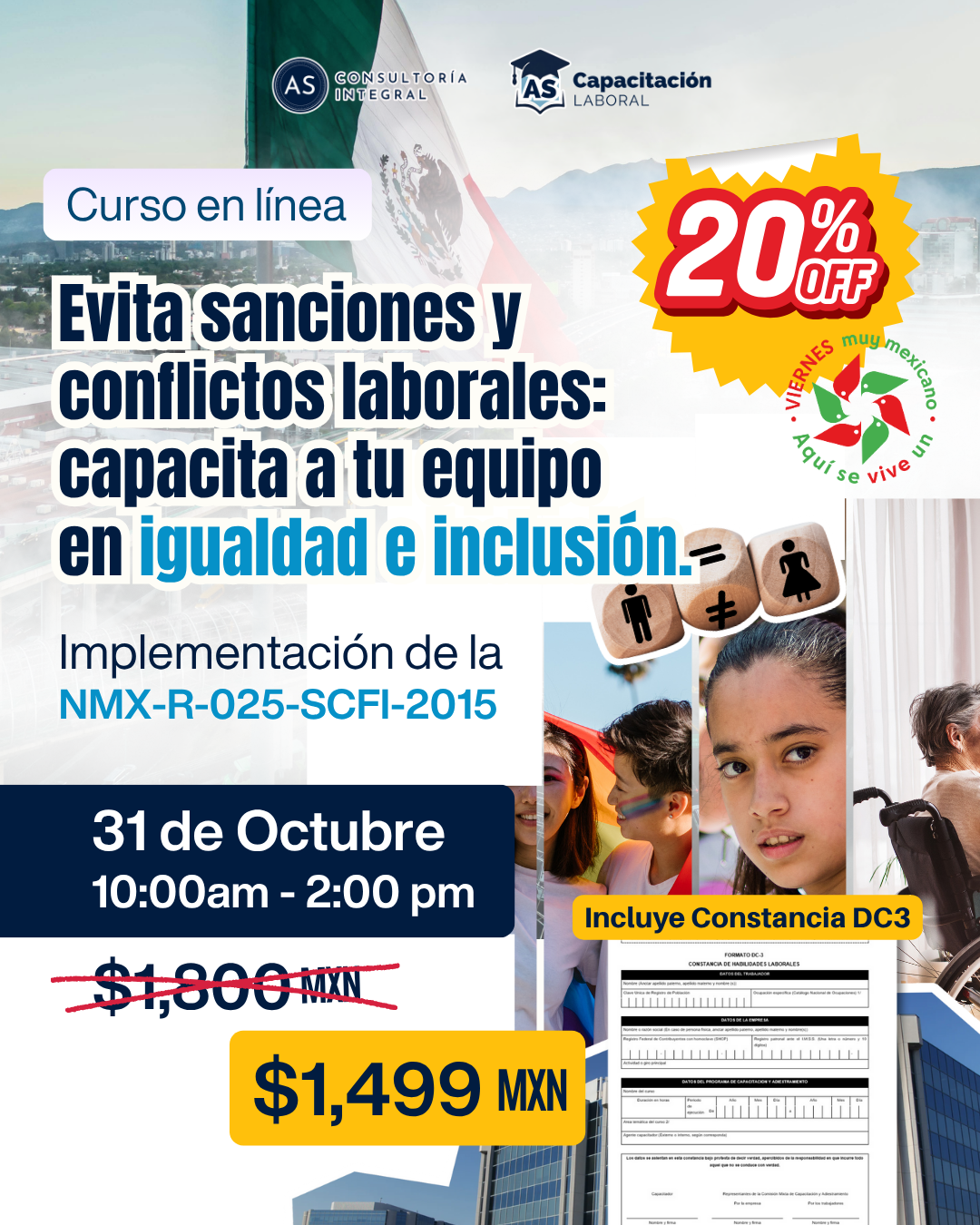 Aprovecha el Viernes Muy Mexicano con un 20% de descuento en nuestro curso oficial sobre la NMX-R-025-SCFI-2015.